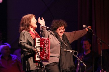 Ensuite c’est Presque Oui qui chante « sa » Nina, puis la « Lola et tout ce qui s’en suit » que se partagent maintenant Michèle Bernard et Francesca Solleville. Il reste sur scène pour accompagner Anne Sylvestre sur « Les vieux, les enfants ». Puis ce sera Entre 2 Caisses, Rémo Gary, Véronique Pestel qui me fait presque pleurer avec « La vieille chèvre », une des toutes premières chansons de Michèle, qui garde le pouvoir de m’émouvoir, trente-cinq ans plus tard… Jean Guidoni précède l’école de musique de Vauvert (j’ignore qui a composé l’arrangement musical de « Nomade » qu’ils nous interprètent, mais il est de toute beauté !). Retour d’Anne Sylvestre pour, en duo avec Michèle, nous apprendre « Le bon côté de la charité », Corentin Coko nous fait la surprise d’une nouvelle chanson (le programme annonçait bien « des surprises »… en voici une bonne !). Un trio se compose sur scène : Michèle, Véronique et Rémo. Puis c’est un quintet : Michèle se joint aux quatre Entre 2 Caisses. Gérard Morel est un sextet à lui tout seul (ne me faites pas dire ce que je n’ai pas dit !) quand il interprète une chanson habituellement chantée par les cinq filles d’Évasion « Nous, les baleines ». Retour de Michèle qui veut faire chanter au public le refrain de sa chanson grecque « Vassilis Kaimos ». C’est pas très compliqué : ça dit « lalala, lalala » ! Et vers la fin de la chanson Michèle se prend carrément pour Nana Mouskouri, elle emprunte la première paire de lunettes disponible et se met dans la voix les trilles de Nana. C’est alors qu’arrive du diable… vauvert (!) le Zorba le plus improbable de la soirée : Juliette elle-même, sirtakant, bouzouquant et caracolant autour de Michèle comme une troupe de cabris… deuxième départ de fou-rire de la soirée (dans le public, tout au moins ! Mais en regardant mes photos, je me dis que Michèle a bien du mal à résister, elle aussi !). Joie de voir arriver la deuxième « surprise » et de voir à quel point les deux chanteuses s’amusent de cette petite blague et se plaisent à se retrouver toutes deux sur scène ! Bien sûr, ce sont les lunettes de Juliette qui atterrissent sur le nez de Michèle pour la partie endiablée de la chanson… et les facéties de Juliette mettent le public en joie ! Il se reprend lorsque Jean Guidoni revient, puis sur le duo Michèle Bernard et Presque Oui… C’est alors qu’une voix « off » commence à réciter « Comme par hasard », un texte un peu triste de Michèle, une histoire de séparation… je me dis « tiens, je connais cette voix ! » Une belle voix profonde et grave… je finis par me dire « Ah ! Ils ont enregistré Joyet parce qu’il ne pouvait pas venir ? » et au même moment émerge de l’ombre… Bernard Joyet lui-même !!! Sacrée troisième super surprise ! Immense frustration, aussi, puisque c’est pratiquement la fin du spectacle ! Tout le monde reviendra chanter en chœur la « Comptine pour enfants sales » avant le salut final. Trop tôt ! Beaucoup trop tôt à mon goût…