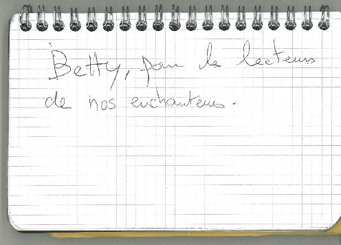 L’heure avance en cette belle fin de journée, l’ambiance se fait plus intimiste et voici qu’il nous sort de sa manche une ravissante petite guitare Martin d’un beau noir mat… Allez, Bernard, une chanson ! Ce sera deux. Tout d’abord, titre de circonstance, Guitar Song : Première guitare / Premiers mots / Premiers accords / et la vie d’un seul coup / a viré de bord… Et puis, un moment de grâce intemporelle, à la demande expresse, je l’avoue, de votre serviteur : une très belle version touchante au possible de Betty, ce qui explique le petit clin d’œil manuscrit qui vous est spécialement destiné ci-contre, chers Enlecteurs. Qui sait à présent ce que nous vous réserverons une autre fois…
