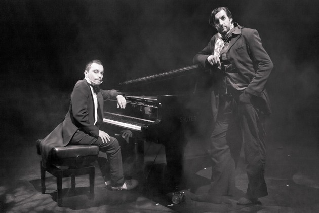 La performance de l’acteur debout, qui a trempé à le tordre son t-shirt noir, répond à l’énergie pianistique de son comparse, qui nous regarde par en dessous avec un sourire presque plus inquiétant encore. Jazz, classique, musique de bastringue ou de film à suspense, mélodie à la Satie, il est le pilier de ce cirque comme le pianiste des films muets d’antan.