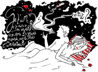 Page après page, on se laisse porter par les lignes douces et rondes du dessin de Lolita. Les volutes de fumée de Gitane enveloppent comme un écrin les ladies (héroïnes), toutes ces figures féminines emblématiques des chansons de Gainsbourg, ses muses, les Marylou, les Lola Rastaquouère, Emmanuelle, Johnny Jane, Melody… Si Jane Birkin, bouleversante, chante Serge comme personne, avec une sensibilité à fleur de peau, Lolita réussit cette même performance à travers son dessin. Tout y est, la sensualité comme la poésie omniprésente. Lolita s’est immergée dans le monde de Gainsbourg qu’elle évoque brillamment avec le rouge violent de la passion et le noir de l’anarchie. Le dessin de Lolita n’est pas si loin de l’univers de la photo de Doisneau. L’humain au centre et l’esthétique au service de la révolte et de l’émotion. On pense à l’accordéoniste de la rue Mouffetard, à Prévert, à Gréco…