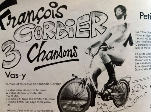 Je me souviens de ma première rencontre virtuelle avec Corbier. Elle date de la lecture du Fluide glacial n°13 (juin 1977). Une double page présentait 3 chansons d’un énergumène photographié à poil sur un vélo. Une autre photo le montrait chantant avec Marie-Paule Belle, légendée Ils sont frère et sœur, peu de gens le savent. Corbier m’a révélé bien plus tard que cette blague l’avait poursuivi durant des années, bien des gens ayant cru à ce bobard (dont moi, à l’époque, je l’avoue !). Allez savoir pourquoi, je n’ai jamais oublié ces 2 images (c’est grave, Doc ?).