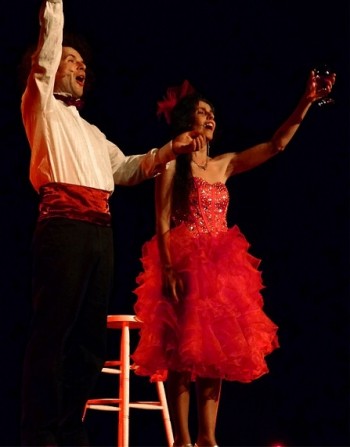 Son personnage joue les clowns blancs, un peu lunaire, tentant de résister à la passion qui émane de sa partenaire, dont le personnage abuse du bon vin qui fait tomber toutes les inhibitions. Le temps de chauffer un peu sa voix, elle pourra lancer les grands airs d’opéra et d’opérettes (j’ai oublié de vous préciser qu’elle était chanteuse lyrique) comme les Bachianas Brasileiras n°5 deVilla-Lobos, hommage à Bach. Ainsi que le célèbre Buvons (Libiamo) de la Traviata de Verdi, ou le Rossignol de Francis Lopez, revisité pour l’occasion par Bruno.