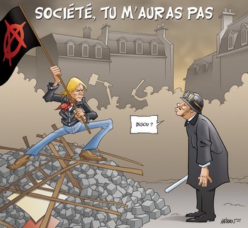 Evoquons d’abord le pinceau de Jean-Marc Héran. Le fringant sexagénaire, qui sévit jadis dans les pages de Fluide glacial, de Pilote ou du Canard enchaîné, est à son affaire dans ces dessins en pleine page, illustrations inspirées de l’univers du chanteur énervant. Parfois, il s’agit d’une évocation du thème de la chanson : des panneaux routier pour C’est quand qu’on va où ?, ou un taureau triomphant pour Olé, par ex… Le plus souvent, c’est une mise en scène de Renaud lui-même, que l’on voit vieillir au fil des pages : son regard désabusé sur les Bobos, sa tendresse pour Pierrot, son trône cocardier d’Hexagone… A chaque fois, l’œil du dessinateur se révèle (im)pertinent, qui fera passer le lecteur par une palette de sentiments : on sourira devant les clins d’œil à Franquin ou à Cabu, on rira des traits d’humour noir ou on sèchera une larme de tendresse naïve et de mélancolie…