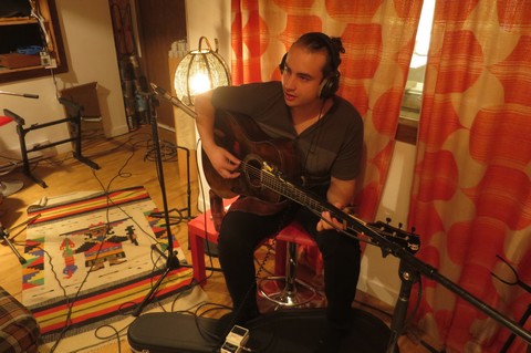 S’il ne se balade pas avec une baguette magique ni avec un hibou, Nicolas Gémus, jeune auteur-compositeur-interprète nourri aux vents des Iles de la Madeleine (Québec), donne fort le vertige d’avoir atterri dans un univers parallèle où parler en chansons serait la norme. Un sursaut d’espace-temps qui se passe sur le fil d’une conversation, au bout de ses doigts qui en pincent visiblement pour les cordes de sa guitare. Ça commence avec la tempête aux Iles de la madeleine : «?des vents à 130 km/h, un HLM entier a brûlé… et ça enchaîne : qu’est-ce qu’il est blême mon HLM?». Tout sujet revient à une chanson, de mots qu’il semble connaître par cœur?; et au bout de l’entrevue-discussion, je suis moins sûre d’avoir obtenu des informations concrètes que d’avoir passé en revue l’histoire de la chanson d’ici et d’ailleurs, évaporée en mélodies.