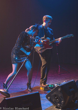 Sarah s’en donne à cœur joie, entre vocalises de chanteuse d’opéra et expressivité toute germanique où sa voix puissante s’exprime librement, une voix, comment dire, de Castafiore barrée, avec le sex appeal d’une Nina Hagen, d’une Catherine Ringer, évoquant des personnages extraordinaires, dignes du Cique des Mirages,  des princesses un peu folles, des aliens en latex…. La voix projette tellement bien les consonnes « Allons nous enivrer / Au bal de Pompadour (…) Allons nous faire piéger / Par la grâce posthume / Des garces arc-boutées /  pour l’ultime posture » que les chansons en anglais qu’elle nous chaloupe après, en mini robe lamée (elle s’est changée en fond de scène derrière un gong asiatique), « Dream, dream silently », malgré l’harmonica furieux et les riffs déchaînés, nous touchent moins. Plus tard une troisième, envoyée un peu au forcing, nous confie pourtant des choses intéressantes, sur la musique déchaînée : « I don’t want no roses, no diamonds » pour revenir au calme sur le « I need you », telle une caricature de chansons à succès.