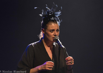Si Manu joue du piano pieds nus, en t-shirt et pantalon de coton, Sarah adopte des tenues sophistiquées de diva punk, kimono (ultra court) puis robe lamée (tout aussi courte) et bas résilles. En 2016 nous avions eu une femme fatale blonde platine au glamour velours, accompagnée de la contrebasse de Stéphen Harrison. Nous la retrouvons toujours « toute crue, toute nue », galina non plus rose mais noire de plumes coiffée, résonnant particulièrement avec cette guimbarde qu’elle fait vibrer à la perfection, accompagnée de la basse expressive, en liberté contrôlée, de Raphaël. Un moment intense, théâtral.