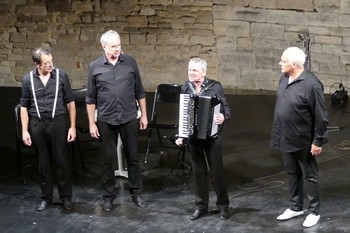 Des souvenirs, de Viricelles à L’Olympia, de La Bourboule à Bréhal, d’un Pithiviers qu’il vous faut éviter… Des filles à Lorient, des spermatozoïdes en lutte pour la victoire finale, des proverbes qui tous nous emmerdent, des signaux affligeants de haine, une relecture particulière du christianisme, toujours l’alcool l’odieux pétrole, l’éloge des pets au lit au goût de brocolis, l’avènement tant espéré de l’andropause… « Et là-haut les oiseaux / Qui nous voient tout petits, si petits / Tournent, tournent sur nous / Et crient « au fou, au fou » ». Répertoire heureux, retour aux fondamentaux (c’est eux qui le disent ; je tiens pour ma part toute l’œuvre de nos quatre gars pour fondamentale) et récital de pure anthologie. Avec l’art de leur propre mise en scène, de ces quatre qui se la jouent collectif, tout en cultivant leur propre personnalité, qui en jouent tant qu’on dirait la meilleure des bédés.