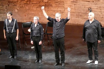 Ça y est, ils ont fait leur récital ultime, leurs adieux, sans aucune promesse de retour, devant un public résolument debout, à les applaudir à tout rompre, les remercier du fond du cœur, comme jamais, comme plus jamais. Dans la cour du château, tout le monde en avait gros sur la caisse, sur la patate. Car c’est bien de décréter qu’on s’arrête, encore faut-il le vivre ce moment des adieux. Après le prestation de Monique Brun et Michèle Bernard, ils sont revenus pour deux chansons avec elles. Avec pour conclure cette rituelle  Herbe tendre avec laquelle ils ont fini chaque concert, chaque disque, saufs les thématiques. Jusqu’au bout, ils ont respecté leurs codes de conduite. Dernier concert, mais l’ultime chanson réservée au lendemain, lors de la rencontre du 11 heures moins 11 : A l’assaut de l’île, une marine de Leprest pour forts en gueule. Un délice. Et une émotion plus que palpable, au bord des larmes, au bord de l’eau… Merci les gars, merci et à bientôt. Ailleurs, forcément autrement. Depuis vos tout débuts, vous êtes parmi nos favoris de la chanson. Et, soyez-en sûrs, le resterez.