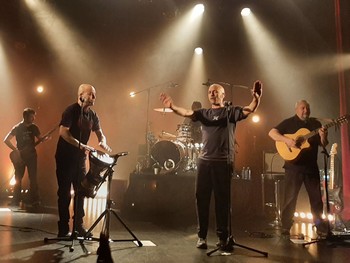Mouss et Hakim version 2021, ce sont deux bêtes de scène excellemment entourées de quatre musiciens : Rémi Mouillerac à la guitare, Yannick Tournier à la basse, Simon Barbe à l’accordéon et Julien Costa à la batterie (également co-compositeur et réalisateur du nouvel album). Quatre complices dont le plaisir de jouer n’est pas feint, chacun ayant droit par ailleurs à son moment de gloire (ce qui nous valut un vitaminé Johnny B. Goode pour faire honneur au guitariste pas manchot). Galvanisés par cette fine équipe, les deux frères assurent le show, parfaitement complémentaires : Hakim plus calme, chantant parfois assis sur un tabouret ou jouant des percussions, Mouss dans le rôle du Zébulon monté sur ressort, ne tenant pas en place et jonglant avec le pied du micro. A cette énergie scénique, ajoutez cet irrésistible accent chantant qui est leur marque de fabrique, les chorégraphies qu’ils nous offrent de temps à autre, les anecdotes amusantes dont ils nous gratifient (le parallèle entre leur mère et la grand-mère de Nougaro évoquée dans la chanson Tes casseroles…). Mélangez le tout et vous obtenez un concert qui rendrait le sourire aux plus dépressifs. De quoi faire sienne à jamais la devise de 100% Collègues : Profitez-en, parce que nous, on en profite !