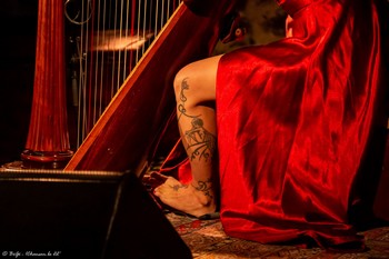 On pressentait l’originalité. Jugez plutôt : pendant l’entracte, à côté du piano habituel, la scène s’était garnie d’une imposante harpe ! Voilà bien un instrument que l’on a rarement l’habitude de côtoyer dans les salles consacrées à la chanson. Etonnement aussi avec l’entrée de l’artiste, dans sa robe rouge qui ne dénoterait pas dans un concert classique, mais pieds nus et tatouages apparents. Et la belle d’attaquer avec Arcs en ciel, chanson d’amour aussi éthérée que charnelle : « Tes regards qui me fixent / Sont mes rayons de soleil / Avec ce qu’il faut de X / Pour que j’en perde le sommeil ». Une première chanson censée être sacrifiée, nous dit-elle, puisqu’on écoute toujours distraitement le morceau d’ouverture d’un concert. Et de souhaiter dès lors que nous ne l’ayons pas suivie avec trop d’attention ! Il ne nous a ainsi fallu que cinq minutes pour avoir l’assurance d’une soirée mémorable, tous les ingrédients étant réunis : une artiste à la voix superbe, un accompagnement musical de haut vol par une multi-instrumentiste émérite, des textes soignés, de l’humour pour emballer le tout.