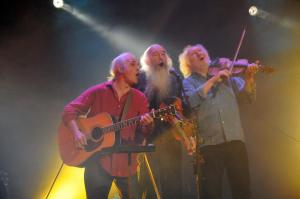 « Dans la forêt des rêves / Marchaient Viviane et Merlin / Main dans la main… » Ah ! Viviane et « ses jolis seins de soleil dans son corsage » ! Légende cousue de rêves, venue de la nuit des temps… Sur scène, trois bardes, crinières blanches, nous la chantent, nous l’enchantent. Comment vous dire ? Ce sont des tronches, des trognes, des trombines, des personnages hauts en couleur, tirés de je ne sais quelle bédé (de Bourgeon sans doute), de quel livre d’enluminure, du Barbaz Breizh ou d’un Cheval d’orgueil… Tout trois guitaristes. Et pareillement violonistes. Et chanteurs et conteurs. Seul Ewen se distingue qui fait flèches de tous bois, ajoutant à son arc le diatonique et le banjo. Tout trois unissent leurs voix à n’en plus faire qu’une : « J’vous dit que le plus beau métier / C’est d’chanter ! » C’est entre traditionnel et folk-song, ces trois font pas le tri : ils prennent tout ce qui vient nourrir leur fringuant appétit. L’inspiration se nourrit d’hier et de demain, en v.o. comme en v.f., de voyages au long cours de Kemper à Concarneau, de pubs en bars, de filles en filles, même si régulièrement elle hante ces années soixante-dix, comme un regret : « On était jeunes on était beaux on était vifs. »