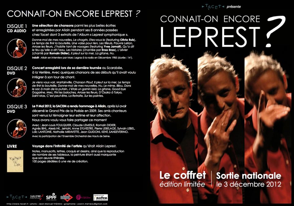 Une compile donc, et deux dévédés. L’un étant le concert enregistré de sa dernière tournée, en l’occurrence au Scarabée, à la Verrière, avec quelques chansons de ses débuts que Leprest avait voulu intégrer à son tour de chant. L’autre est cet hommage que la Sacem a rendu à l’Allain en mai dernier : des amis chanteurs était venus lui témoigner leur estime, leur affection. On y retrouve Jean-Louis Foulquier, Claude Lemesle, Romain Didier, Agnès Bihl, Alexis HK, JeHan, Anne Sylvestre, Pierre Lebelage, Sylvain Lebel, Loïc Lantoine, Nathalie Miravette, Jean Guidoni, Kent et Sanseverino.