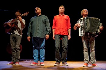 Jean-Michel Mouron, Dominique Bouchery, Gilles Raymond et Bruno Martins (les gardiens, la muséographe étant la dive et enivrante Juliette) ont imaginé ce spectacle pour tout le monde, y compris et surtout pour les enfants (c’est dommage, on a oublié de s’en faire livrer hier au soir). Avec non des chansons gamines mais la fleur de sel de celles du poète. Des vraies, des grandes, avec des morceaux de gros mots et des grumeaux à l’intérieur. C’est beau. Dire qu’à l’époque, on n’écoutait pas. Ou alors sous le manteau, sous la radio. Maintenant on sait qui est ce poète, on le célèbre même… Les temps changent, les gens du temps d’alors n‘étaient pas civilisés et les poètes avaient un train et deux métros d’avance. Avec respect et amusement, nos quatre gardiens, ces Entre 2 Caisses-là, font revivre cet auteur pour qui grouillaient les vers et s’en remplissaient d’autres. Ça grouille encore, c’est fou : ça vit. Allez j’vous laisse : en ce moment, le poète (Alain Leprest, 1954-2011) et le père La Pouille doivent jouer aux dés chez l’père Youssef.