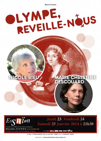 Olympe, réveille-nous, Jeudi 23, vendredi 24 et samedi 25 janvier à L’Essaïon, à Paris. Réservations au 01.42.78.46.42. Le site de Nicole Rieu, c’est ici. Ce que NosEnchanteurs a déjà dit de Nicole Rieu, c’est là.