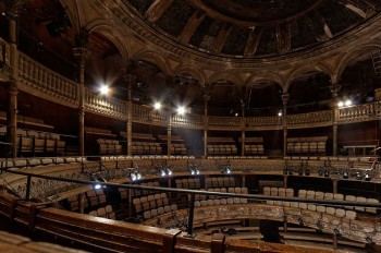 Pour ceux et celles d’entre vous qui n’auraient pas la chance de connaitre cet endroit extraordinaire, sachez que rien ne laisse imaginer depuis la rue que cette façade haussmannienne des plus banales, coincée entre deux épiceries tamoules (miamm…), dissimule un tel petit bijou aux pierres patinées par le temps, une fantastique salle de 500 places, cathédrale élisabethaine païenne tout en hauteur, aux murs écaillés et aux boiseries cérusées, laissée quasi en l’état dans les années 1970 lorsque Peter Brook la redécouvrit et décida de lui redonner vie après ses folles années du XIXème siècle.