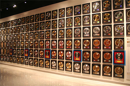 Brillant de mille feux et pavoisant tout le mur du fond, une foultitude de disques d’or (Perret, Maurane, Kaas, Farmer, Delpech, Lio et beaucoup d’autres) illuminent l’espace, rappelant l’heureux temps ou les albums se vendaient comme des petits pains… Au hasard des vitrines, une lettre manuscrite d’Édith Piaf (mise à prix 500/600 €), une très belle photo de Birkin issue de la séance de prises de vues pour la pochette de l’album Melody Nelson (1300/1500 €), les bandes masters du concert de Brel à l’Escale le 3 décembre 1961 (3000/3500 €) ou