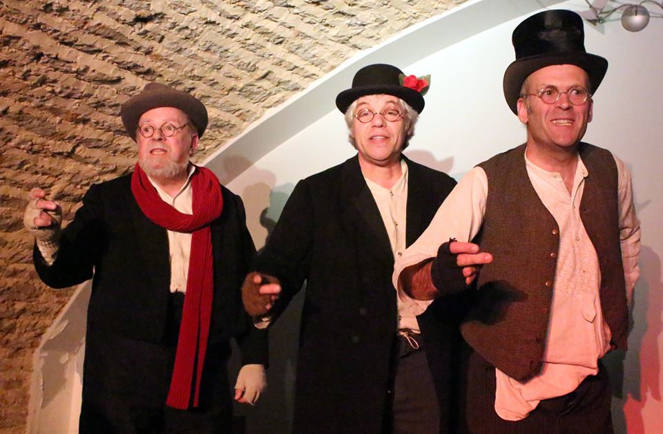 Voilà une petit groupe bien sympathique qui, le temps d’un récital, vous entraîne avec gourmandise dans les rayons du répertoire. Ce sont trois messieurs respectables qui se sont constitués un petit stock de chansons dans lequel ils piochent en fonction des circonstances de leurs prestations. Pour le Festival Dimey, dans l’auditorium en sous-sol de la médiathèque qui porte son nom, ils ont fait honneur au poète. L’ambiance est créée par quelques accessoires : chapeaux, lunettes rondes à montures fil de fer, vestes élimées et pantalon retenu par une ficelle, caisses à bouteilles pour servir d’estrade ou de tabouret, et, évidemment, litrons… Ils chantent a capella sans accompagnement instrumental, souvent à l’unisson (au moins les refrains, les couplets étant parfois partagés) et, de temps en temps, se fendent d’un final en polyphonie. Ils annoncent les titres et demandent ensuite si quelqu’un connaît l’auteur, au moins des paroles, ils ne citent pas les compositeurs et c’est dommage ! Et chacun aime se réapproprier ces chansons qui pour une bonne moitié a déjà titillé les neurones de sa mémoire. Sélectionnées avec soin dans les œuvres de Ricet Barrier, Georges Brassens, Boris Vian, Léo Ferré, Claude Nougaro, Boby Lapointe, Henri Tachan, Gaston Couté, Francis Blanche, Serge Gainsbourg et quelques autres, dont bien entendu Bernard Dimey, toutes leurs chansons plaisent et accrochent car elles présentent des personnages, racontent des histoires ou des événements, brossent des tableaux ou évoquent de petites scènes. Ce réalisme puisé dans l’entrepôt de la chanson française est aussi un des éléments de l’attrait d’ « un chat dans la main ».