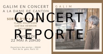 Galim aurait dû faire son concert de sortie d’EP, le bien nommé Faire Face, sur la péniche de La Dame de canton avec ses musiciens… Elle a été contrainte de nous présenter ses chansons en direct de chez elle, face à son écran plutôt que son public, à écouter : 1- Faire face ou fuir à 2’50 », 2- Saigner des rêves 6’10 », 3- Zappar 11’30 », 4- Sans la nommer (Moustaki) 15’00 », 5- La femme à bulles 19’00 », 6- Le sorcier du Prado 24’30 », 7- Cannibales 31’20 », 8- Une envie égoïste 37’30 ». Elle a également participé au Festival Fleur des Chants, voir le précédent article.