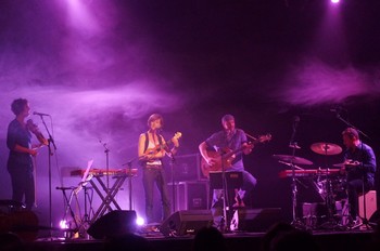 En première partie de soirée, découverte de la Liégeoise Val et ses bateleurs Une auteure-compositeure-interprète, Valérie Mathieu, magistralement entourée de quatre musicien.nes (batterie, guitare, violon et violoncelle). Un groupe acoustique bien au point, s’adonnant à un mélange de musique traditionnelle, de swing et de jazz manouche. Dommage que les textes des chansons ne soient pas à la hauteur de leur superbe écrin musical, manquant d’accroche et sans point de vue clair, tombant dans l’oubli à peine écoutés… (photo Annick Delperdange)