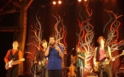 Lorsque l’on pénètre dans les lieux, s’offrent à nos regards, en fond de scène, des rideaux ornés du visuel de leur nouvel opus, un enchevêtrement multicolore de racines (ou de branches ?), et un plancher jonché d’instruments. C’est que les six membres de DSLZ, vêtus de couleur différente en un ensemble chatoyant, – Simon Mimoun, Romain Sassigneux, Cédric Ermolieff, Olivier Sulpice, Thomas Benoît et Chadi Chouman – ont plus d’une corde à leur arc. Jugez plutôt : guitare, banjo, mandoline, ukulélé, batterie et percussions diverses, violon, contrebasse, clarinette, trombone, hélicon, trompette, clavier, flûte, biniou…, et on en oublie peut-être, tous seront de la partie, pour un concert tonitruant au son parfait, chaque instrument étant audible sans que l’ensemble ne vienne jamais couvrir la voix des chanteurs. C’est malheureusement trop rare pour qu’on ne le souligne pas : chapeau bas à l’équipe technique !