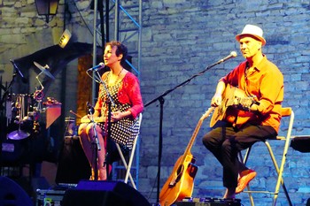 Ceux qui, comme moi, suivent depuis des lustres ce duo marseillais, Vyviann Cayol et Jean-Yves Liévaux, ont été comblés : vivre en direct des noces de porcelaine est chose rare, appréciable et joyeux événement. La précédente venue d’Alacaz à Barjac, en 2014, alors au Pradet, avait été quelque peu gâchée et écourtée, on s’en souvient, par un précédent concert qui avait duré bien au-delà du temps réglementaire. Là, nos éternels tourtereaux se produisent sur la vaste scène de la cour du château : ils vont y étaler leur bonheur de vivre et la juste étendue de leurs sentiments. Parler de chanson d’amour est finalement étrange à Barjac, si elle n’est accompagnée d’un fort alibi poétique. Il n’en manque d’ailleurs pas à Alcaz, même si ses vers ne sauraient rivaliser avec ceux de Ronsard ou de Lamartine. Et on trouvera (si, si!) des spectateurs leur faisant reproche d’être trop « Nous Deux », trop « variété » : chanter le bonheur à deux serait-il impudique à leurs oreilles ?