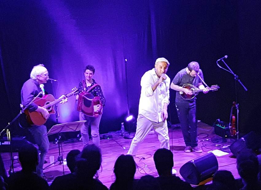 Tout de blanc vêtu, son habituelle casquette vissée sur le crâne, voilà qu’apparaît notre zébulon roubaisien, qu’on croirait monté sur ressorts. De belles pointures sont là pour le seconder : Pascal Chardonne à la guitare, Lorcan Fahy au violon et à la mandoline, Lolita Pariaud à l’accordéon. Avec un HK à l’œil rieur et le sourire aux lèvres, et un public familial, mélangeant allègrement les générations et prêt à dégainer ses applaudissements et pas de danse endiablés, la soirée s’annonçait donc chaude.