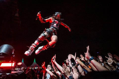 Restait pour achever la soirée le tout gros morceau : le concert de Shaka Ponk ! Après 22 ans de carrière, le groupe a annoncé vouloir arrêter pour se consacrer à d’autres projets dans le domaine de la défense de l’environnement. Ils ne nous quittent cependant pas sans une ultime tournée, intitulée The Final Fucked Up Tour. Et le moins que l’on puisse dire, c’est que c’est un adieu tout en puissance ! Difficile d’ailleurs de relater un tel concert. C’est simple : jamais je n’ai vu une telle prestation ! Tout était grand, démesuré, grandiloquent. Une scénographie incroyable, avec des projections à foison sur écrans géants tapissant l’immense fond de scène, un light-show démentiel, un son énorme. Pour entourer Frah (le chanteur), Sam (la chanteuse) et leurs 4 compères musiciens, rien de moins qu’un chœur de 16 membres, tout de blanc vêtus, disposé des deux côtés du plateau dans un saisissant effet de scène.