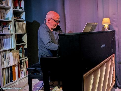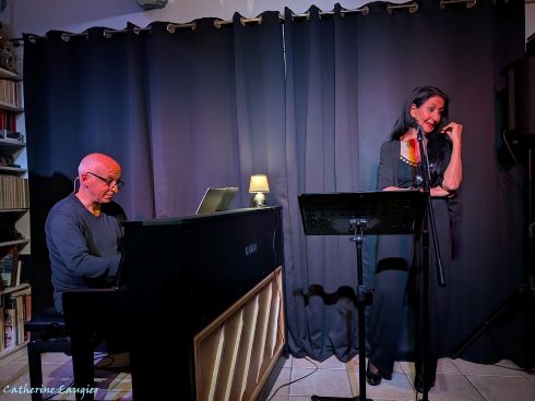 Quant à Sébastien Jaudon, il nous confirmera ses talents de diseur et de chanteur, déjà entr’aperçus dans de précédents concerts, en sus de son talent de pianiste sensible. Enfilant les alexandrins dans cet exercice de virtuosité, Le quartier des Halles (1) (Les diables sont partis) mis en musique par Claire Taïb dans un style « vocalchimiste » à la André Minvielle. Le choix des chansons s’est fait au plus petit dénominateur commun, mais ils se sont vite aperçu qu’ils étaient sur la même longueur d’onde. Et, là encore, ils se répondent avec une grande complicité. Ouverture avec « J´mange un piano vers les vingt heures la lalala / Je ramène tout l´monde, les gosses, ma gueule / Le mec perdu, la vieille toute seule / C´est pour l´amour, pas pour la gloire / Je viens vous voir » de Leprest qui situe immédiatement le concert. Si les mélancoliques Arrose les fleurs ou Une valse pour rien « La solitude est seule en piste » sont bien connues des Leprestophiles, Si tu me payes un verre écrite pour Reggiani est introduite par un texte plus rare de Dimey, Je vais me foutre à l’eau, (demain !) qui se joue des mots pour une promesse de sobriété dite avec humour par Sébastien Jaudon.